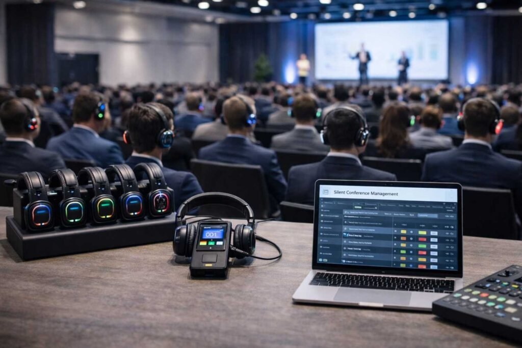 Headphone-based silent conference equipment for noise-free audio delivery in workshops, parallel sessions, and multilingual events.