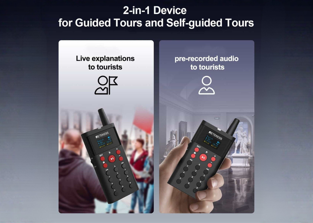 Tour guides can provide real-time narration using the transmitter microphone, ensuring direct communication with visitors.