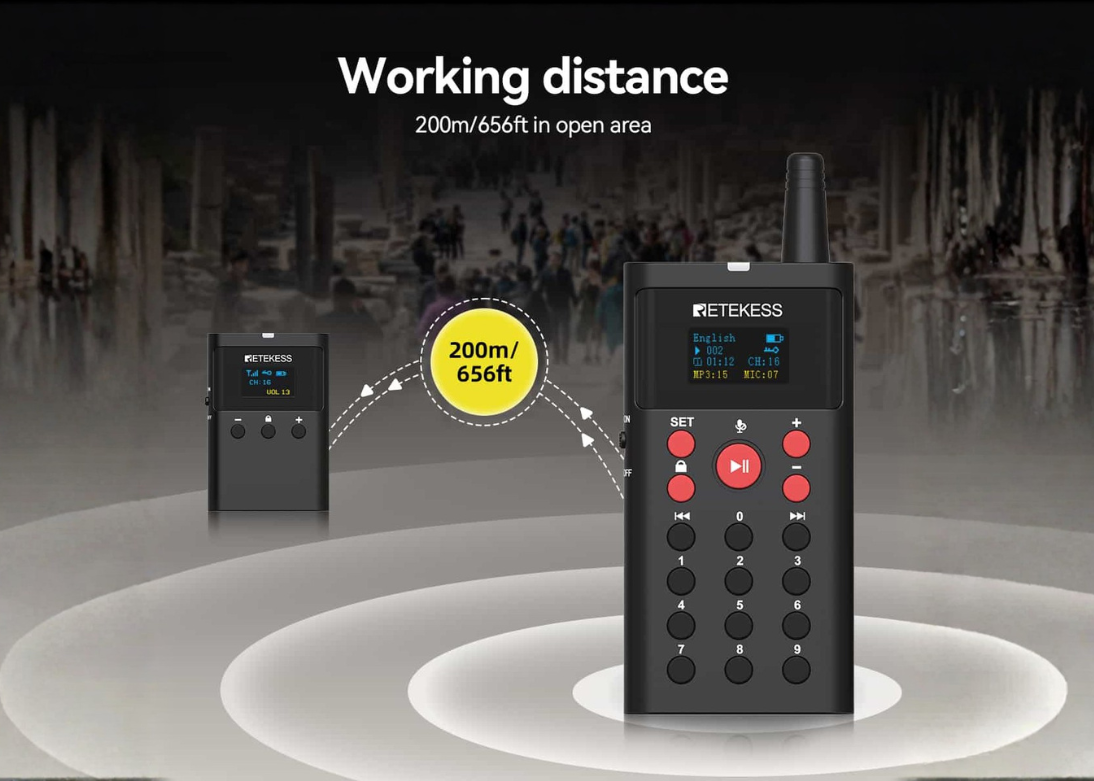Thanks to its wireless communication range of up to 200 meters, visitors can move comfortably around the site without needing to stay close to the guide. Clear audio transmission ensures that every participant can hear the explanation even in busy or noisy environments.